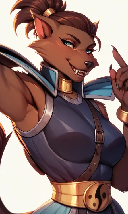 toned, ponytail hairstyle, brown fur, furry, Ninja, female furry, armor, fangs, teeth, Ninjara