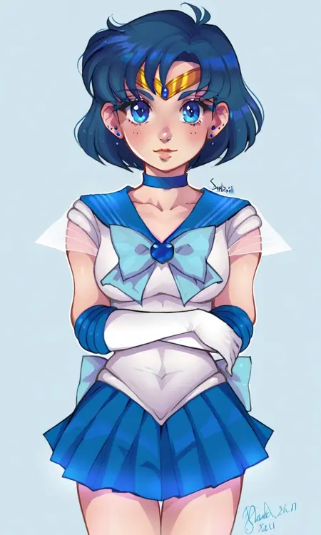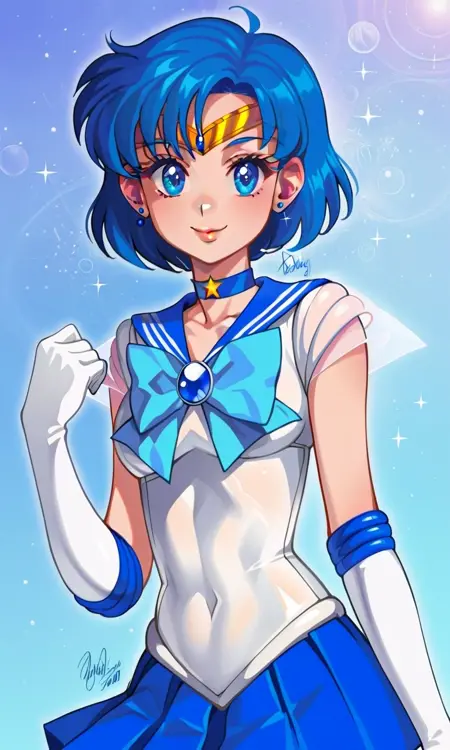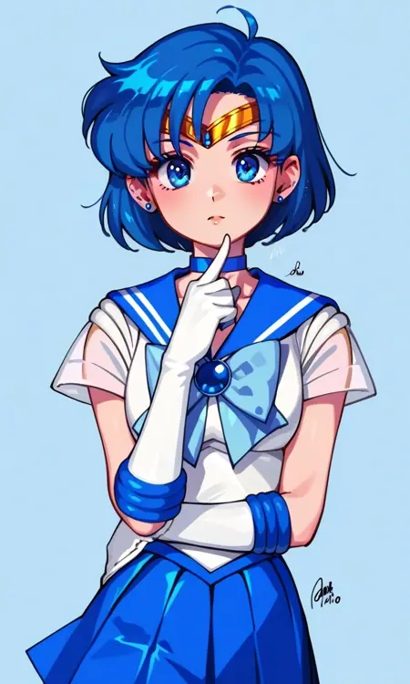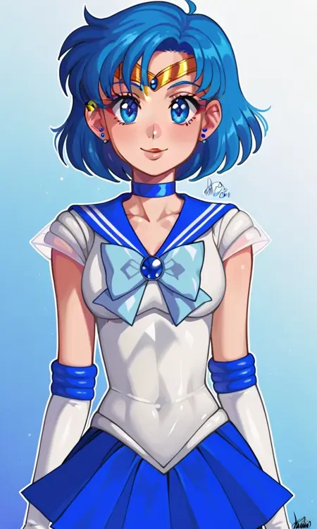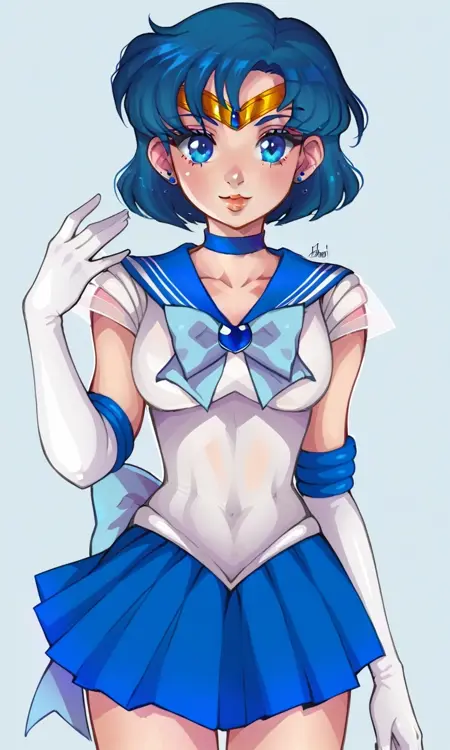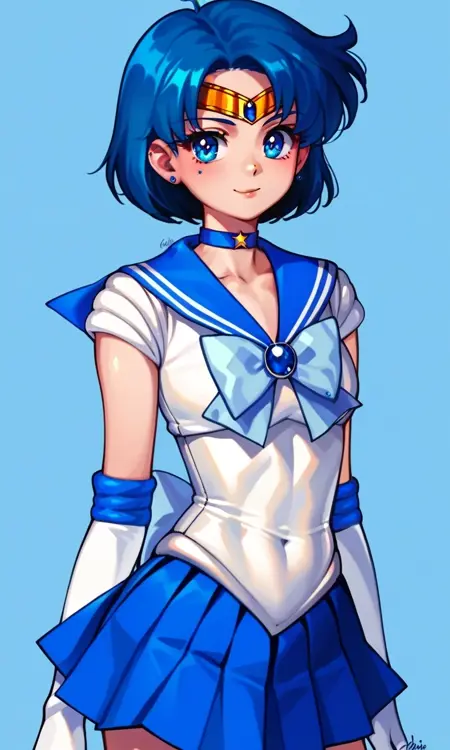 sailor mercury,1girl, short hair, blue hair,earrings, sailor senshi uniform,blue eyes, blue choker,tiara, blue sailor collar, blue bowtie, white shirt, elbow gloves, white gloves, pleated skirt, blue miniskirt