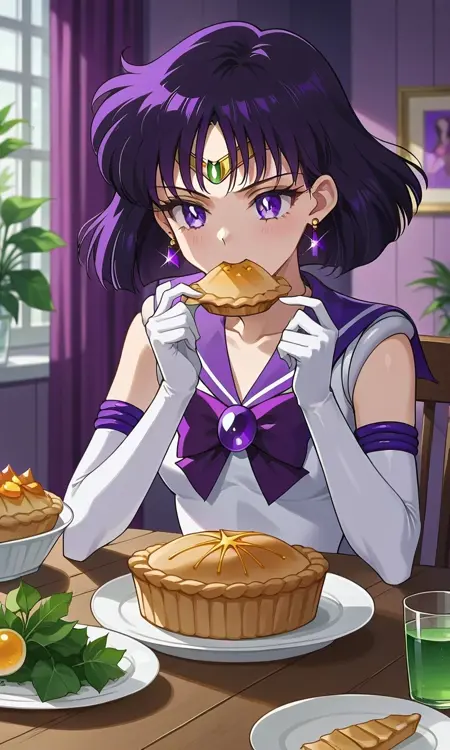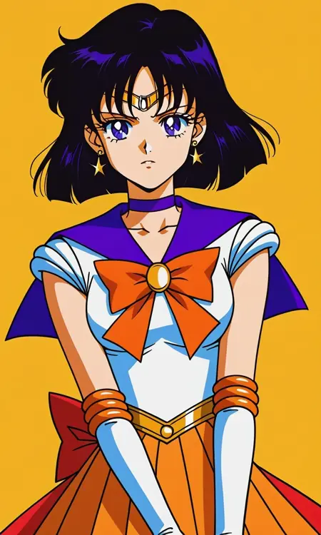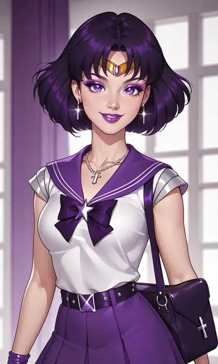 Sailor Saturn, 1girl, bob cut,tiara,earrings,sailor senshi uniform,purple eyes, purple choker, purple sailor collar, red bowtie, white shirt, elbow gloves, white gloves, pleated skirt, purple miniskirt