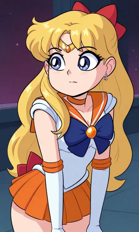forehead jewel,orange gemstone,1girl, long hair, hair bow,bangs, red bow,blonde hair,earrings, sailor senshi uniform,blue eyes, orange choker,tiara, orange sailor collar, blue bowtie, white shirt, elbow gloves, white gloves, pleated skirt, orange miniskirt
