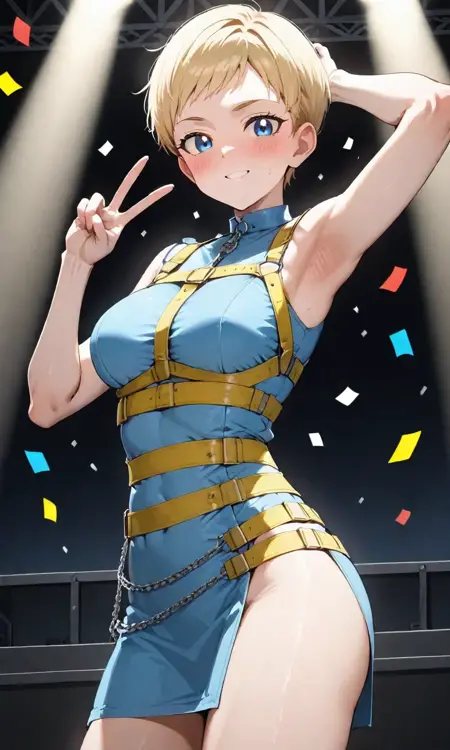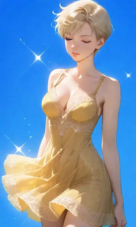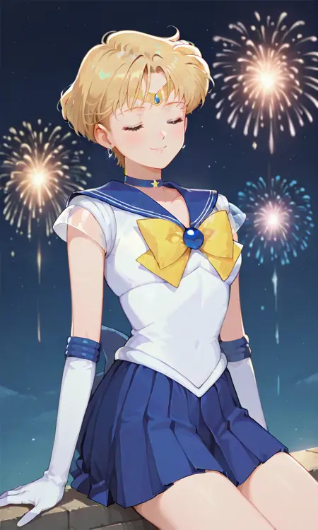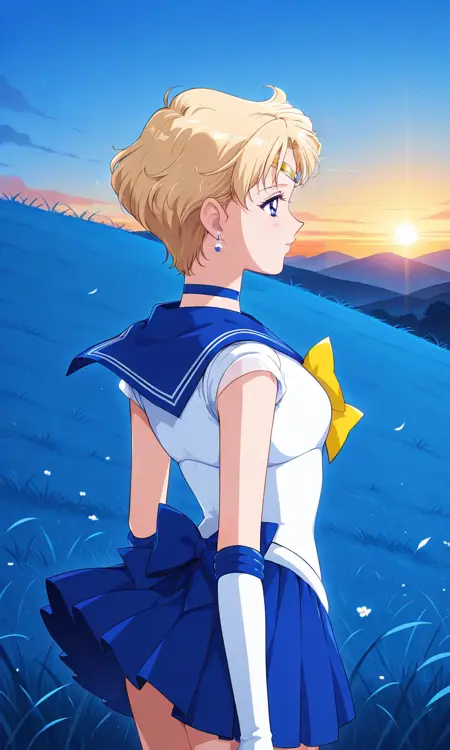 Forehead jewel, blue gemstone, 1girl, very short hair, blonde hair, sailor senshi uniform, earrings, night sky, blue choker, tiara, blue sailor collar, yellow bowtie, white shirt, elbow gloves, white gloves, pleated skirt, blue skirt