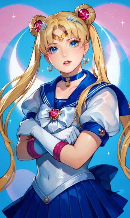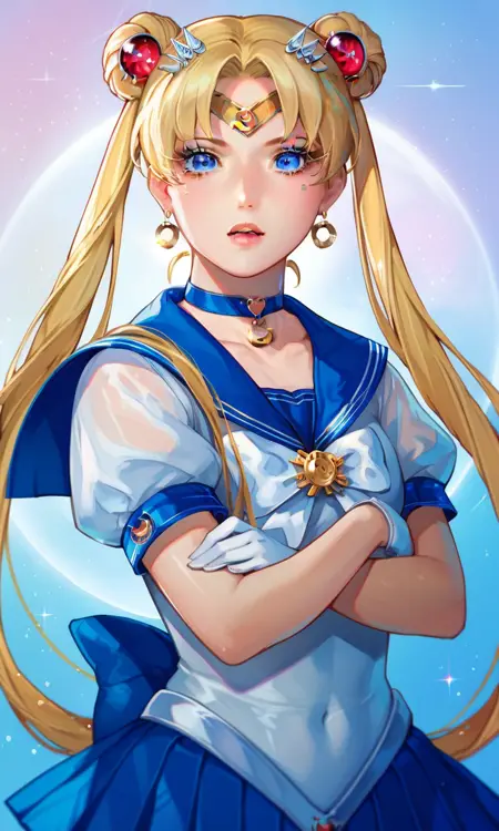 | Trained Words | sailor moon,1girl, long hair, blonde hair, double hair bun, twintails, usagi tsukino,earrings,blue eyes,red choker,tiara,blue sailor collar, red bowtie, white shirt, elbow gloves, white gloves, pleated skirt,blue miniskirt, sailor senshi uniformCopied! 1girl, princess serinity, crescent forehead mark, blonde hair, long hair, twintails, double bun hair, off-shoulder dress, blue eyes, gold-trim, puffy short sleeves, long dress, collarboneCopied! 1girl, long hair, double bun, twintails, hair ornament, parted bangs, tiara, earrings, blue eyes, heart choker, blue sailor collar, red bow, white shirt, see-through, elbow gloves, white gloves, multicolored skirt, white skirtCopied! 1girl, long hair, double bun, twintails, hair ornament, parted bangs, forehead mark, earrings, blue eyes, wings, heart choker, blue sailor collar, heart brooch, white shirt, puffy short sleeves, elbow gloves, white gloves, yellow skirt, layered skirt Copied! |