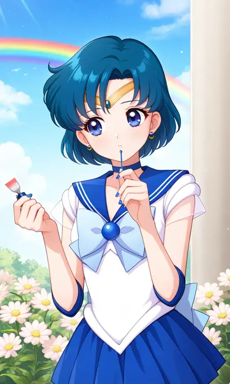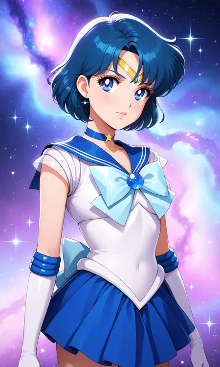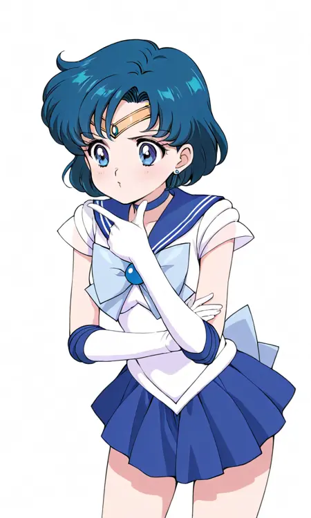 forehead jewel,blue gemstone,1girl, short hair, blue hair,earrings, sailor senshi uniform,blue eyes, blue choker,tiara, blue sailor collar, blue bowtie, white shirt, elbow gloves, white gloves, pleated skirt, blue miniskirt