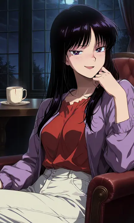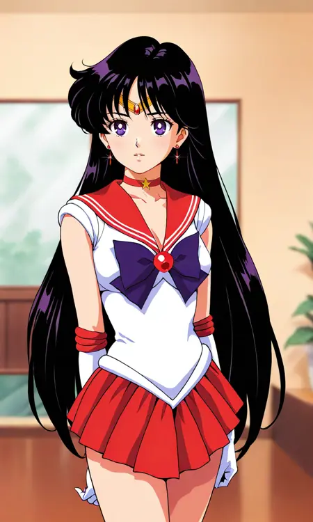 | トレーニングワード | Forehead jewel, red gemstone, 1girl, long hair, black hair, bangs, sailor senshi uniform, earrings, purple eyes, red choker, tiara, red sailor collar, purple bowtie, white shirt, elbow gloves, white gloves, pleated skirt, red miniskirtコピーしました! |