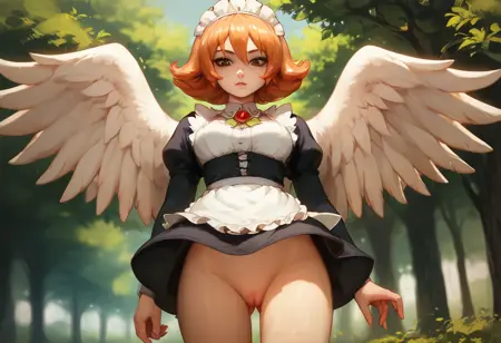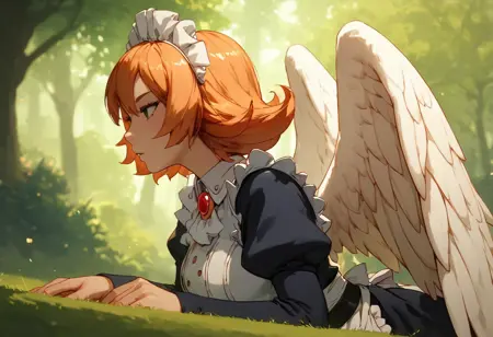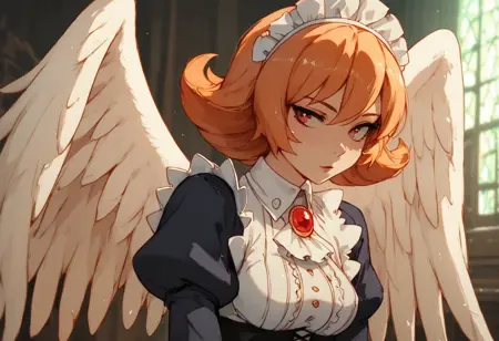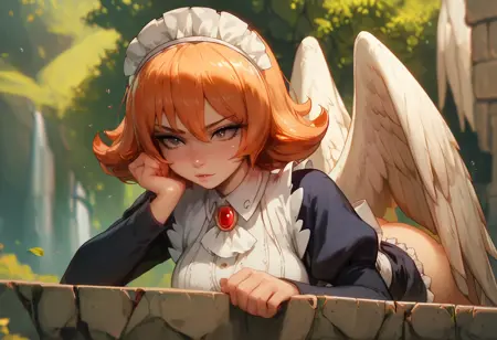 meidri_cinn, half harpy, 1girl, maid, maid headdress, feathered wings, orange hair, short hair, flipped hair, white wings, long sleeves, apron, monster girl , red eyes