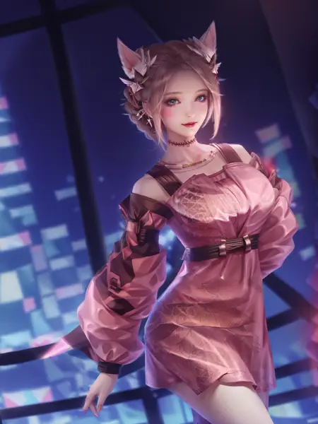 - WZRYgongsunliWXXSG, 1girl, solo, looking at viewer, blue eyes, short hair, dress, grey hair, breasts, puffy sleeves, choker, chain necklace, mature female, cityscape, night, makeup, eyelashes, light smile, hand on hip,