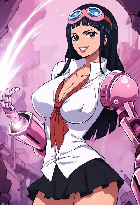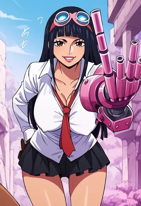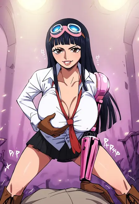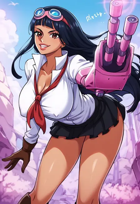 AhiruOP,1个女孩,单独,赛博格,机械假肢,机械左臂,黑发,长发,棕眼,嘴唇,大胸,乳沟,白色衬衫,红色领带,白皙皮肤,短裙,长袖,棕色手套,护目镜戴在头上,齐刘海,单机械臂,黑色裙子,及膝靴