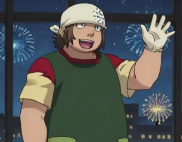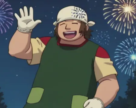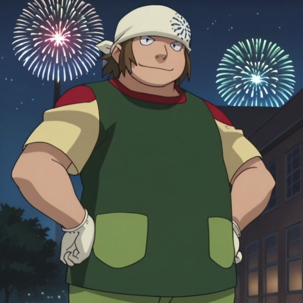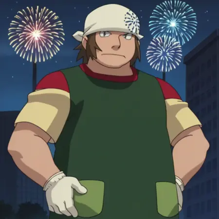 プロンプト: 男性、肥満、茶色の髪、灰色の目、バンダナ、黄色のシャツ、短袖、エプロン、緑のズボン、ブーツ、白い手袋、屋内(スライディングドア/工場)