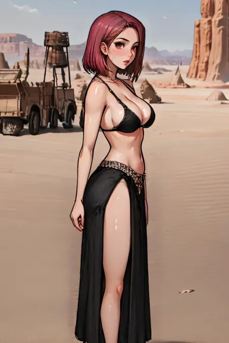 This LoRA for MePrincess, a fiction character with clothing ( attire , consisting of a halter bikini top featuring thin straps and a deep V-neckline, accentuating her toned shoulders. The bikini bottom consists of a long, flowing black skirt made from sheer fabric with a slit on the side that reveals a tantalizing hint of skin. A beaded waistband adorns the skirt, sparkling with small silver sequins for added elegance and intrigue)