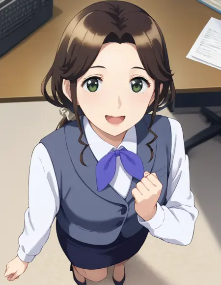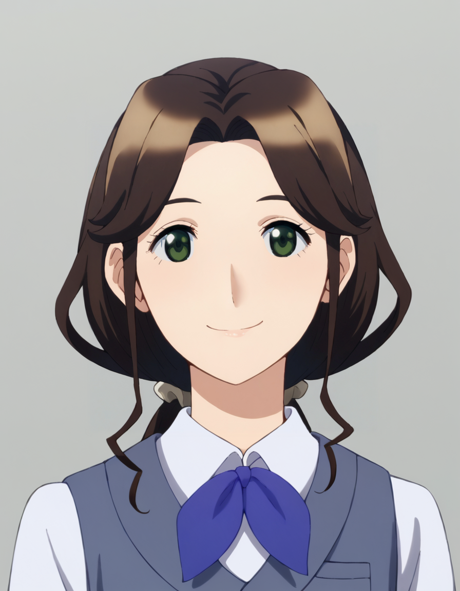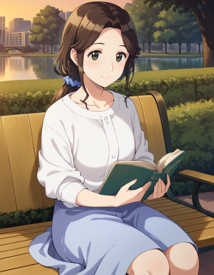 konomi moriya, long hair, brown hair, low ponytail, parted bangs, sidelocks, dark green eyes