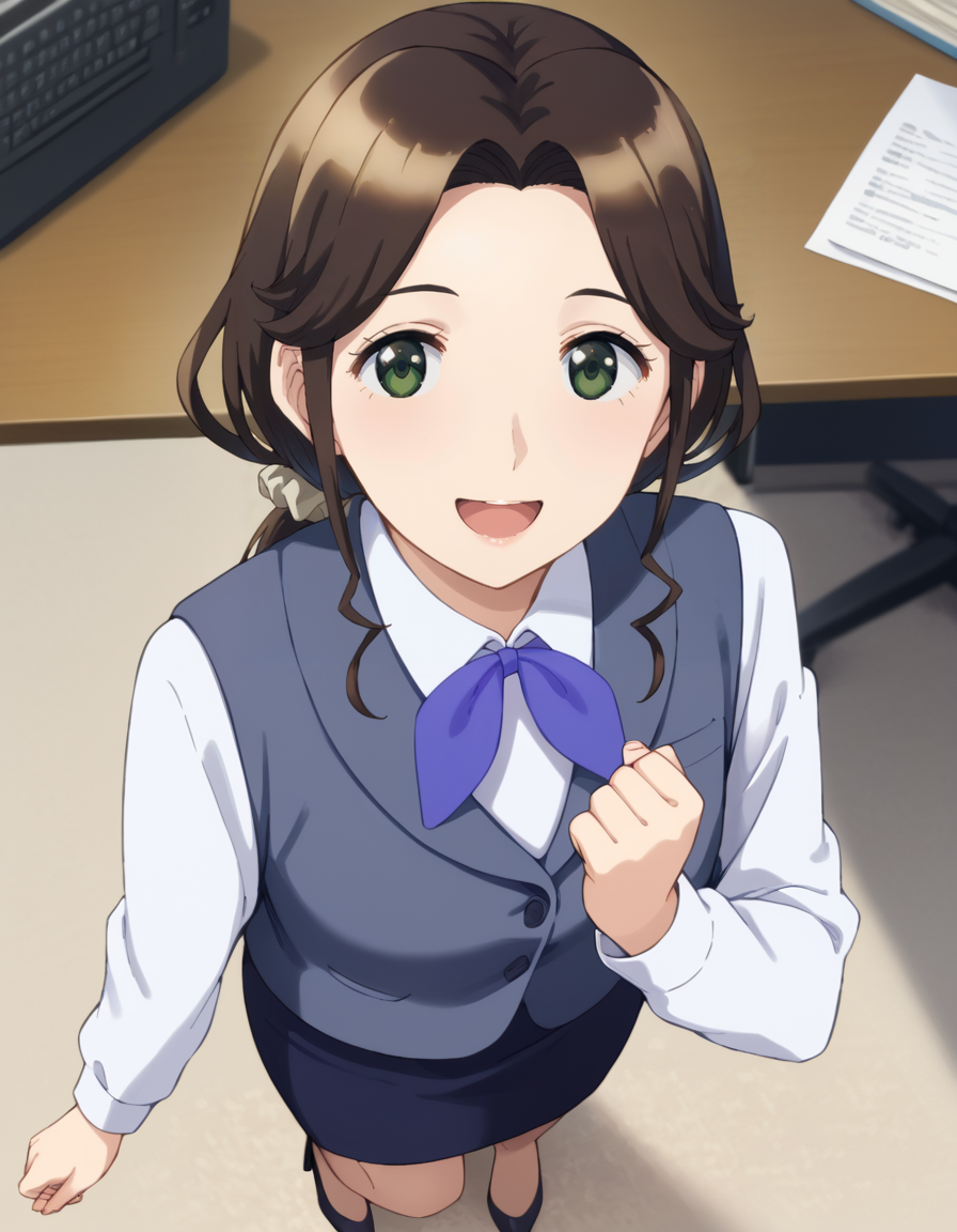 white hair scrunchie, work uniform, white collared shirt, blue vest, blue bowtie, long sleeves, pencil skirt, high heels
