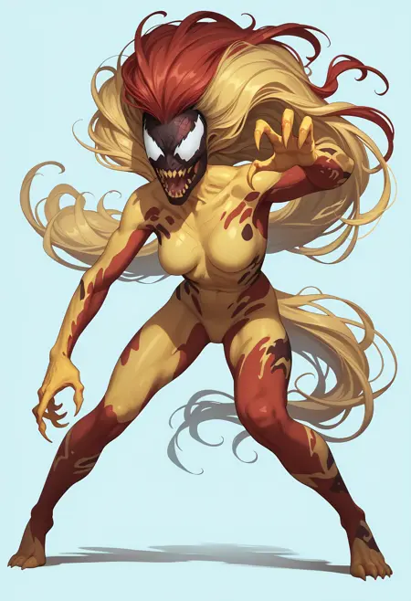 1girl, fscream, breasts, red hair, blonde hair, very long hair, multicolored hair, colored skin, yellow skin, teeth, sharp teeth, monster, claws