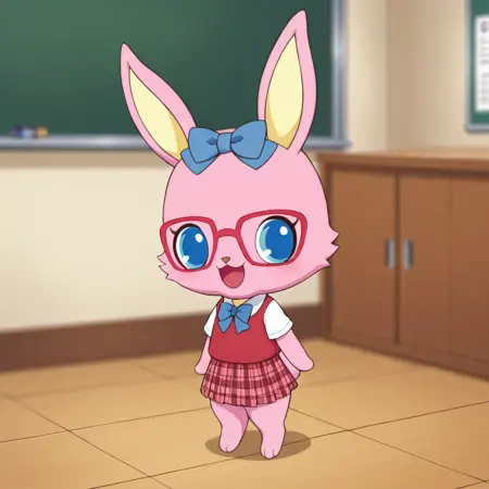 치비, 페랄, 디지티그레이드, 여성, 퓨리, 라고모르프, 콩나물 귀, 갈색 코, 분홍색 털, 노란색 귀 안쪽, 노란색 귀 안쪽, 노란색 가슴 털, 흰 진주 목걸이가 달린 파란 코반트 보석, 눈썹 없음, 빨간 안경, 파란 눈