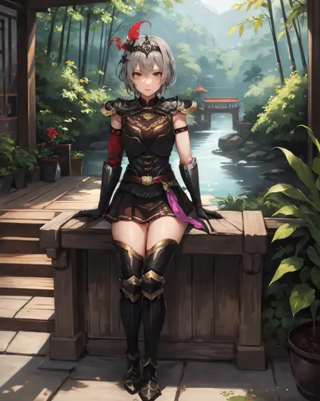 armored dress, shoulder armor, black skirt, thigh boots, armored boots, gloves,