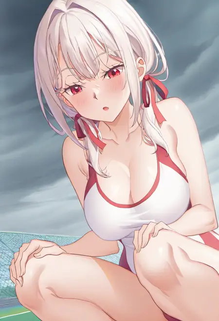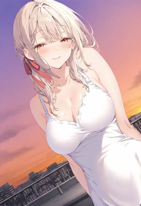 默认主提示词: sakura chisato通用提示词: 发带,吐舌,红眼睛,中长发,红色发带,露胸,裸肩,大乳房
