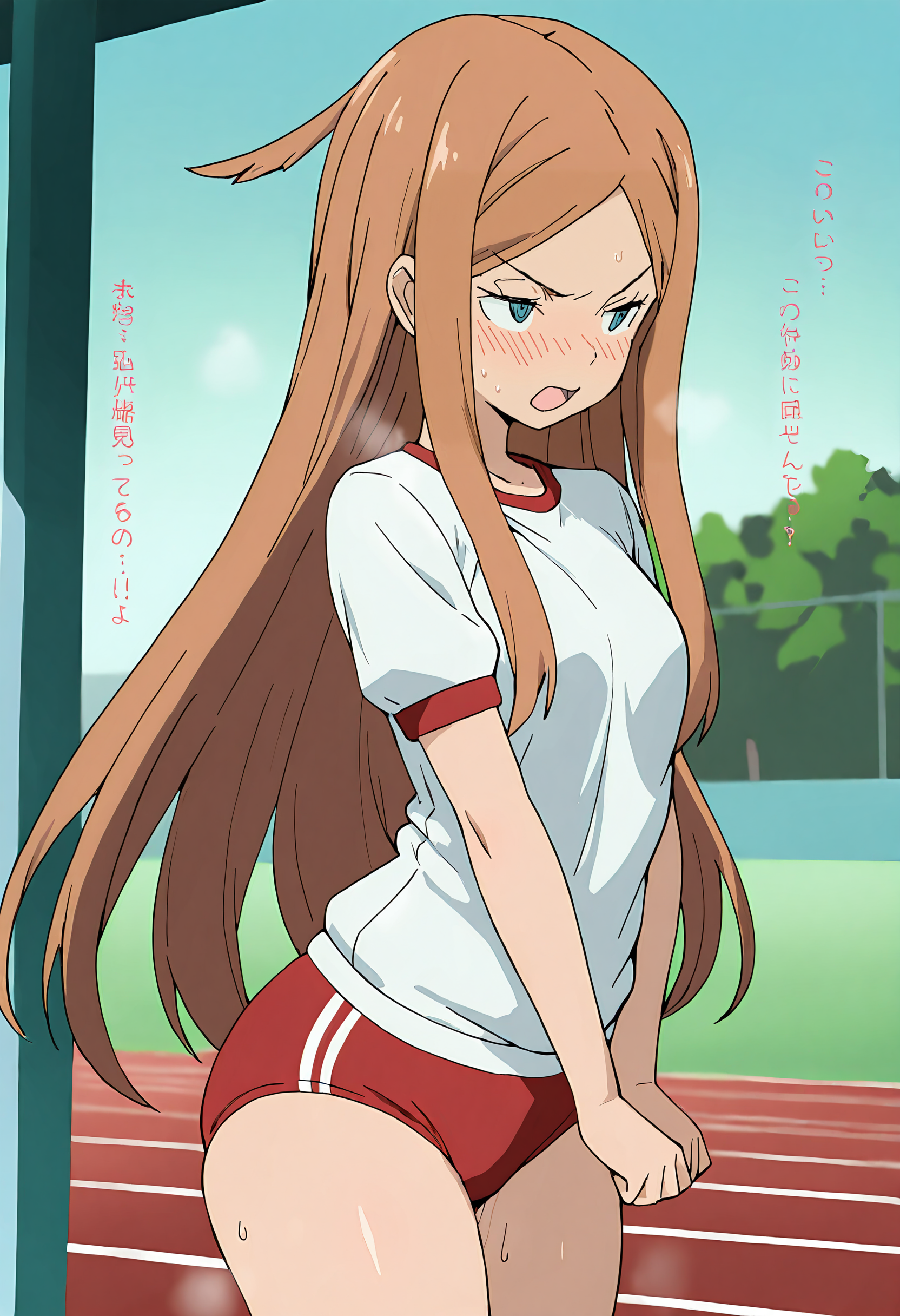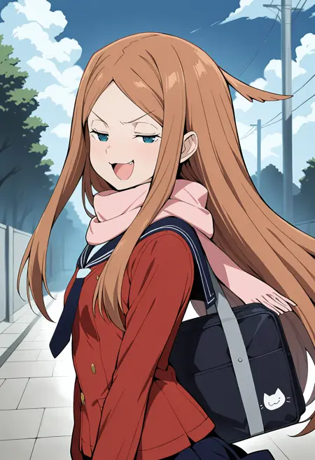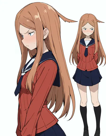 Konami_Kirie,1girl,brown hair,long hair,blue sailor_collar,blue necktie,red shirt,blue skirt,black kneehighs