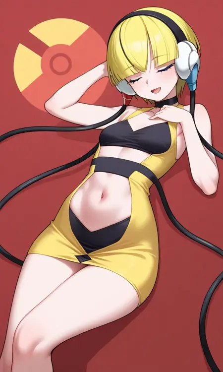 사용: Elesa, 중간 플랜, 노란 상의 드레스, 검은 스타킹, 인상적인 포즈, 빛나는 배경