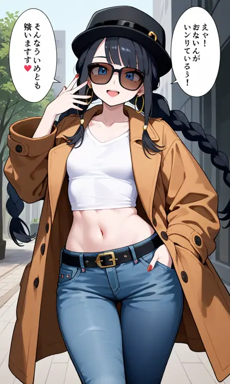 사용: Elesa, 대안 옷, 캐주얼 재킷, 데님 반바지, 선글라스, 도시 거리 배경