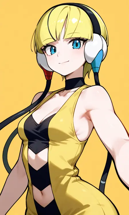 사용: Elesa, 중간 플랜, 노란 코트가 어깨를 부분적으로 덮음, 자신감 있는 포즈, 흐릿한 배경