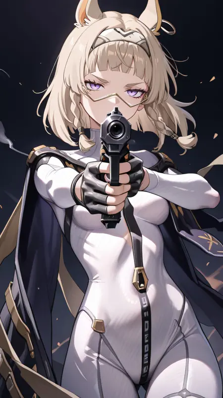복장: 손가락 없는 장갑, 검은 장갑, 바디슈트, 가슴