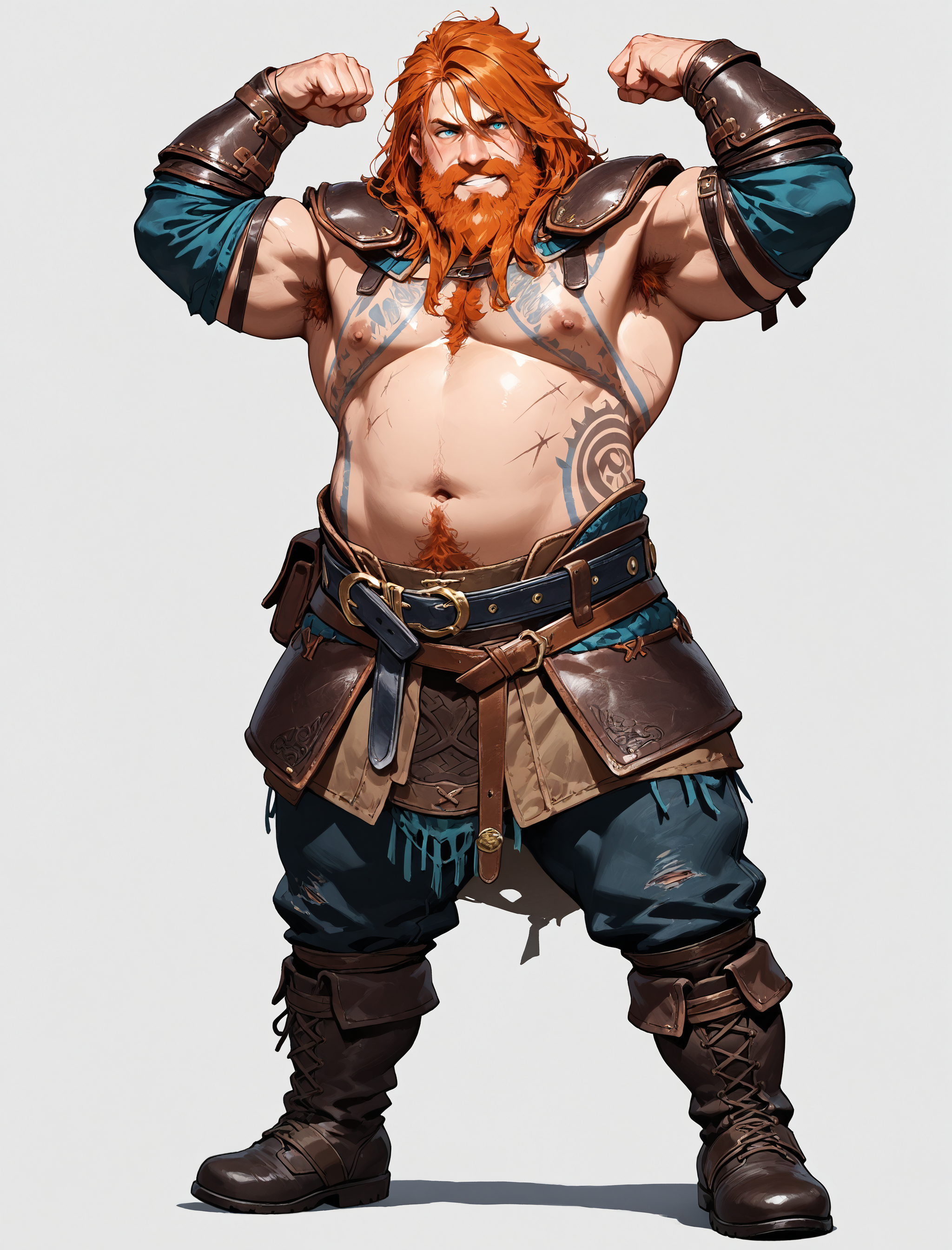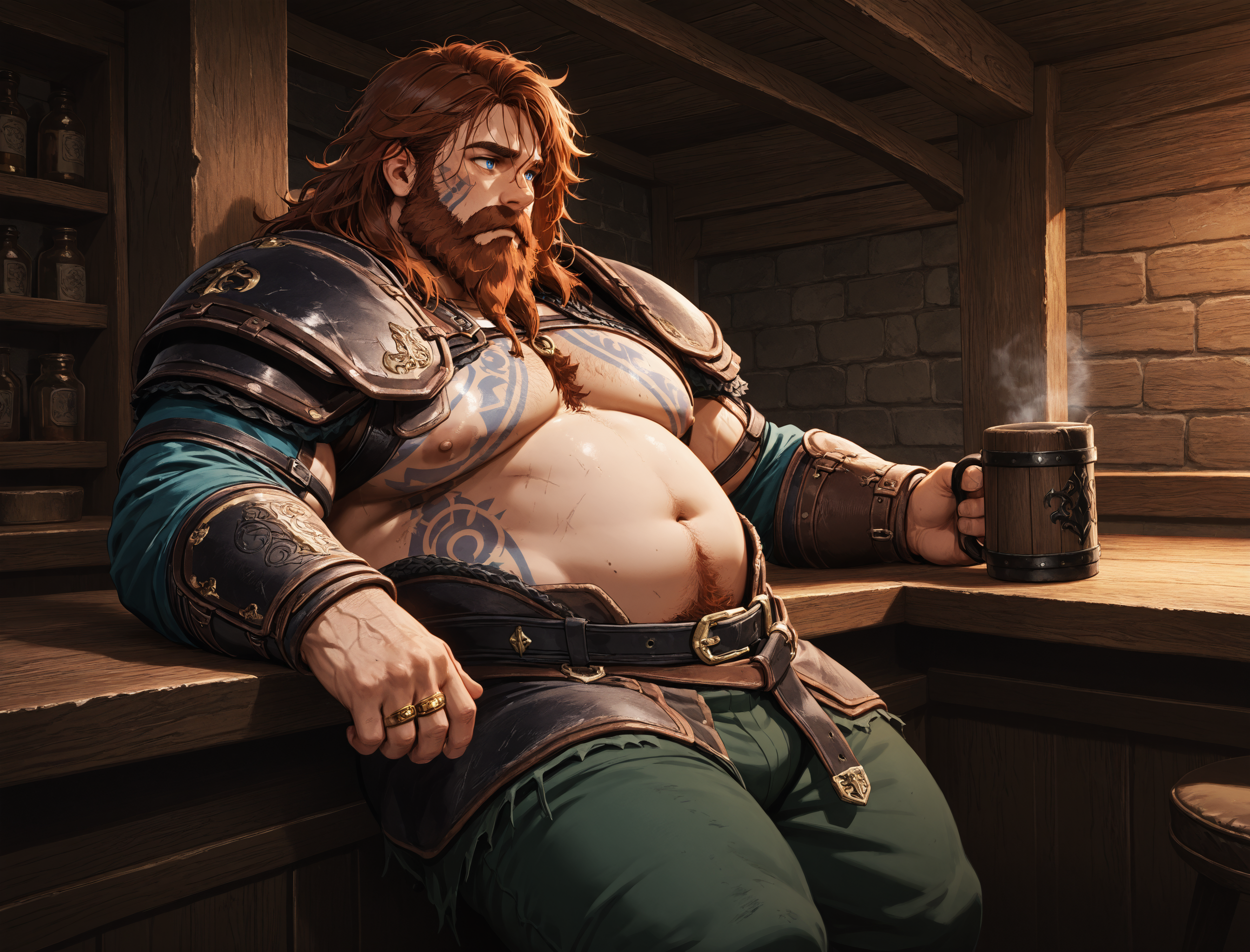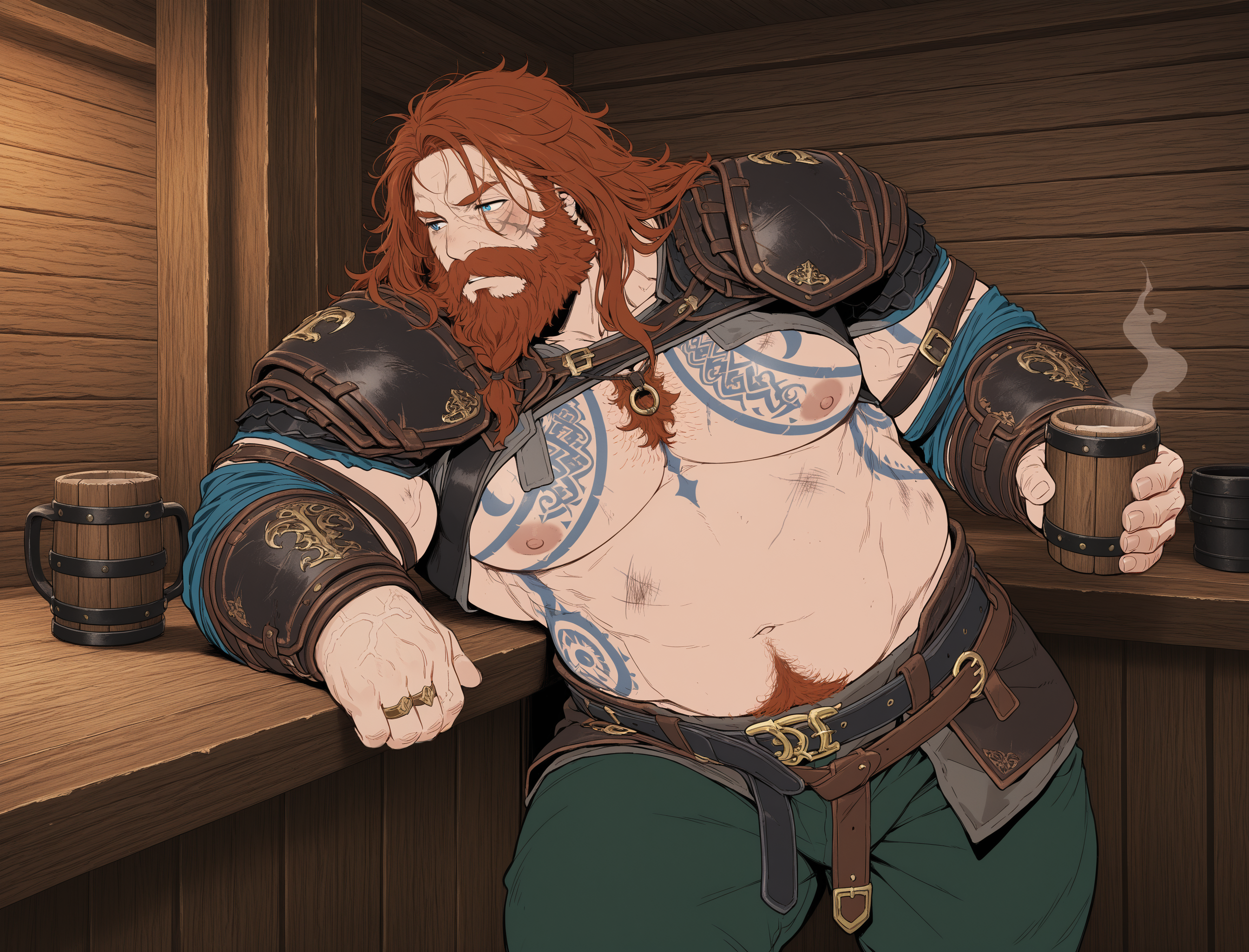 Helping prompt: blue eyes, mustache,beard,facial hair,tattoo, (plump or belly or etc)