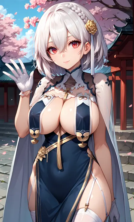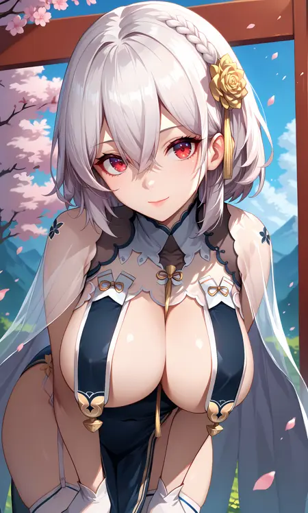 天狼星,红眼,白发,短发,刘海,胸帘,灰色连衣裙,蓝色连衣裙,胸部间丝带,袜带,半指手套,骨盆帘,暴露服装,白色手套,白色过膝袜,胸部显露,发饰花,透明装,侧边编发,花卉图案
