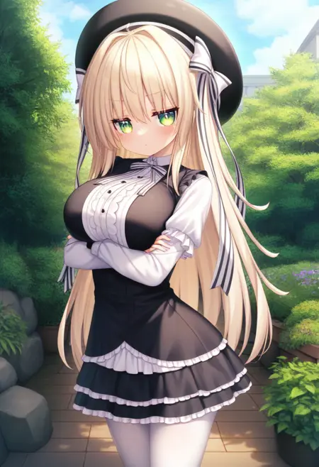1소녀, 녹색 눈, 긴 머리, 금발 머리, 모자, 혼자, 손을 허리에 얹음, 머리카락 흐름, 시청자 바라봄, 드레스, 가슴, 뺨에 홍조, 큰 가슴, 카도야 야에카