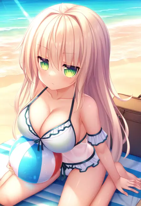 1소녀, 긴 머리, 가슴, 혼자, 녹색 눈, 금발 머리, 손을 허리에 얹음, 배꼽, 수영복, 큰 가슴, 녹색 비키니, 머리카락 흐름, 미소, 아호게, 뺨에 홍조, 웃음, 시청자 바라봄, 체크무늬, 카도야 야에카