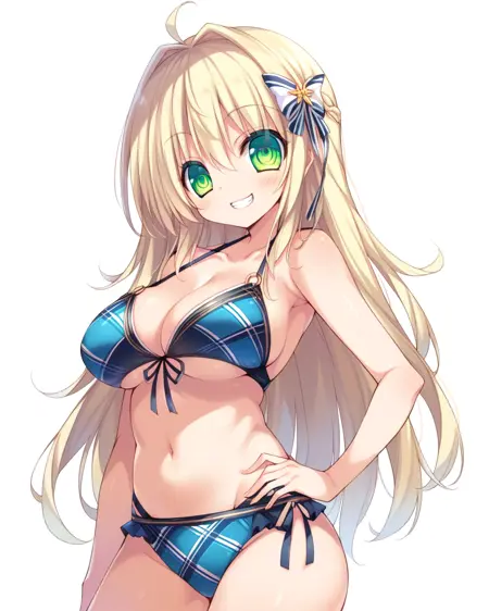 1girl, long hair, breasts, solo, green eyes, blonde hair, hand on own hip, navel, swimsuit, large breasts, green bikini, hair intakes, smile, ahoge, blush, grin, looking at viewer, plaid, kadoya yaeka