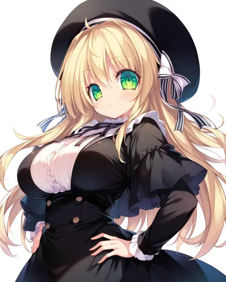 1girl, green eyes, long hair, blonde hair, hat, solo, hand on own hip, hair intakes, looking at viewer, dress, breasts, blush, large breasts, kadoya yaeka