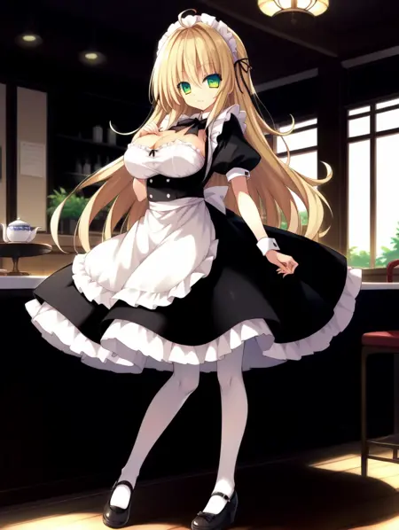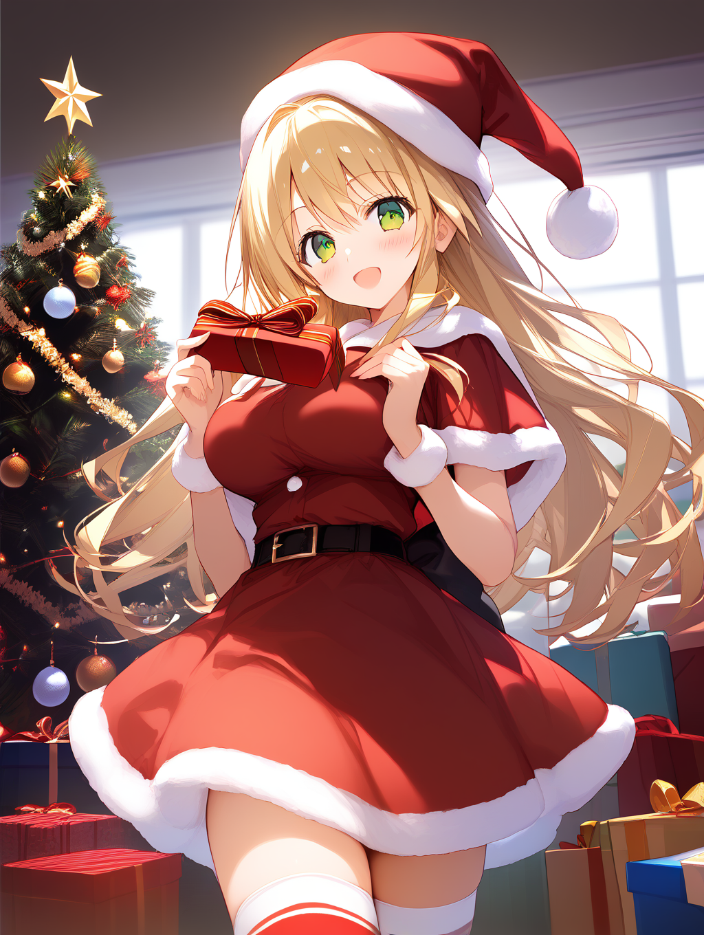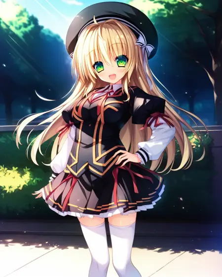 1个女孩,绿色眼睛,金发,帽子,张嘴,长发,单独一人,手放在臀部,长袖,微笑,看着观众,发丝飘动,校服,朱丽叶袖,脸红,加藤屋夜香,白色过膝袜,