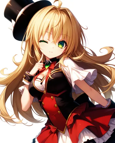 1个女孩,绿色眼睛,长发,金发,帽子,单独一人,手放在臀部,发丝飘动,看着观众,连衣裙,胸部,脸红,大胸部,加藤屋夜香
