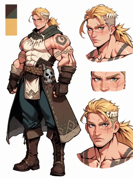 highres, hi res, best quality, masterpiece, intricate details, absurdres, 4k, semi realistic,,"NEXT THE BASE PROMPT"--> CharacterDesignIllustrious, reference sheet, simple white background, (color guide:1.2), (multiple views), (full body), dynamic pose "NEXT THE CHARACTER CHARACTERISTICS" --> blonde, blue eyes etc.