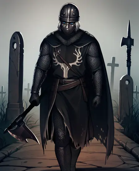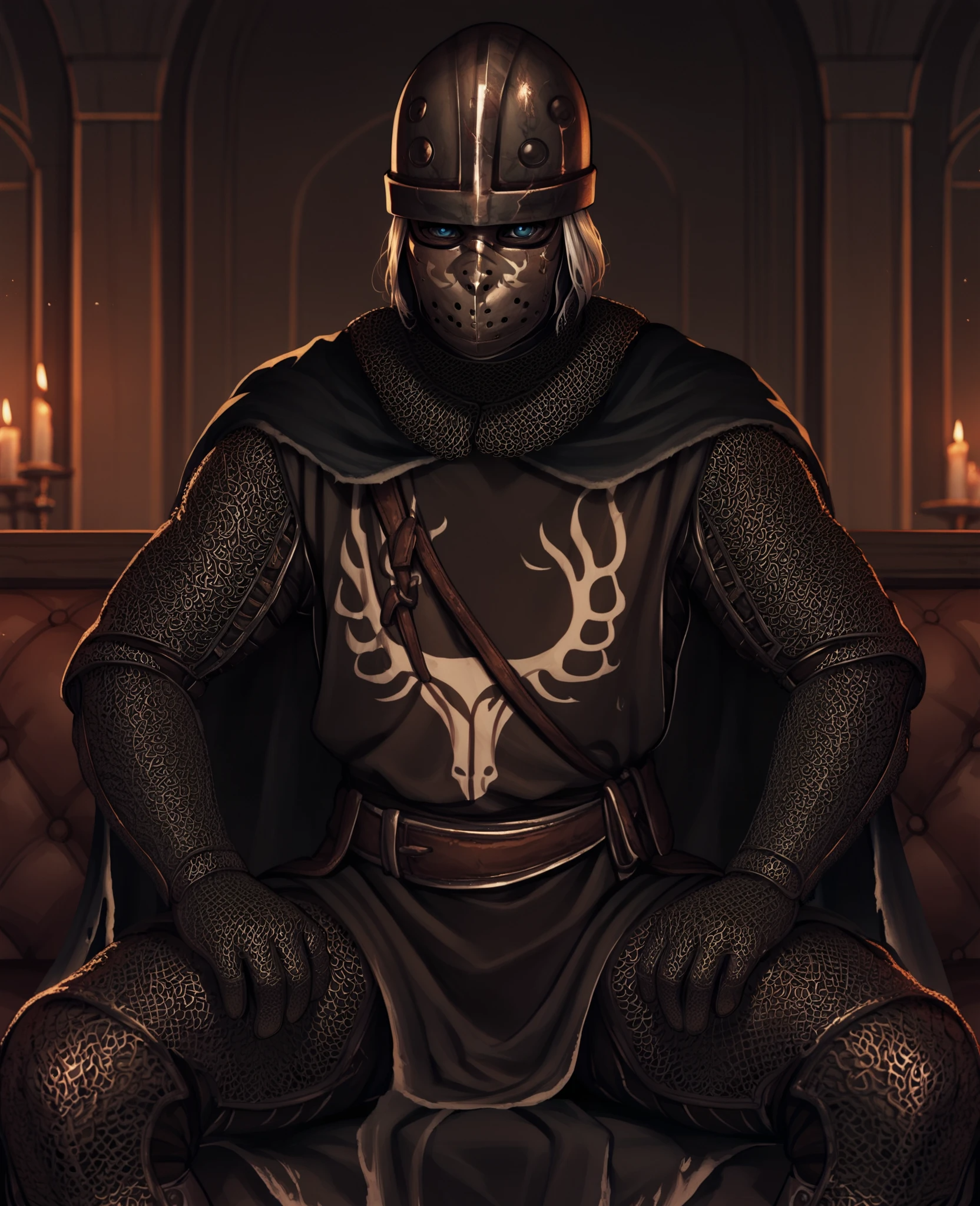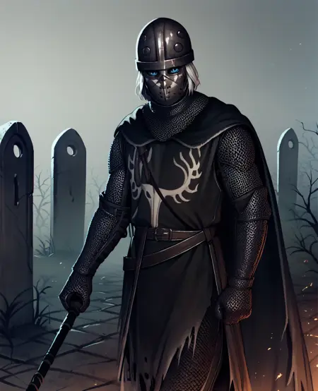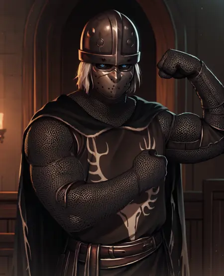 트리거: CreightonDS2, 1boy, 마스크, 흰색 머리, 파란 눈, 회색 투피스, 헬멧, 갑옷, 사슬갑옷, 완전 갑옷, 망토