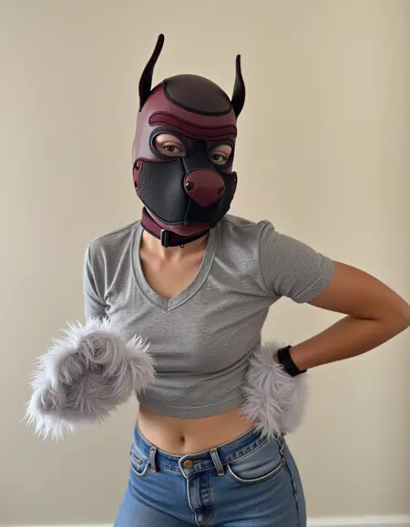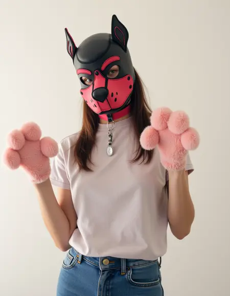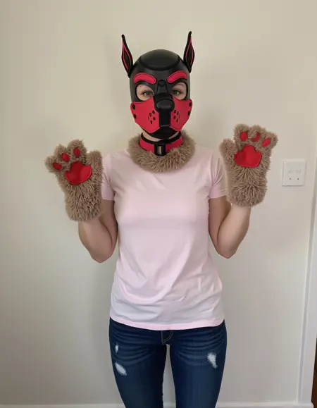 a woman in jeans and a tshirt wearing a pup play mask and collar,with fluffy paw gloves