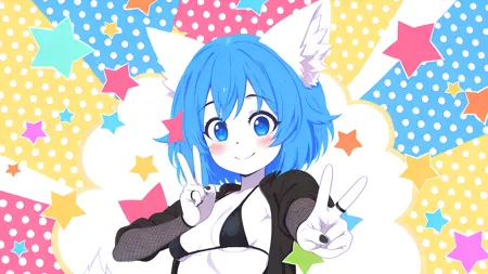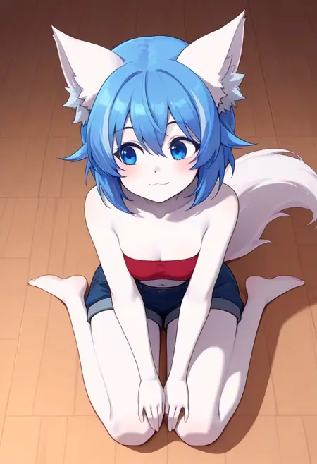 wolfychu, animal ears, blue hair, white bangs, multicolored hair, blue eyes, tail, short hair, animal ear fluff, fox ears, fox tail, fox girl, furry female, white skin, white fur, virtual youtuber