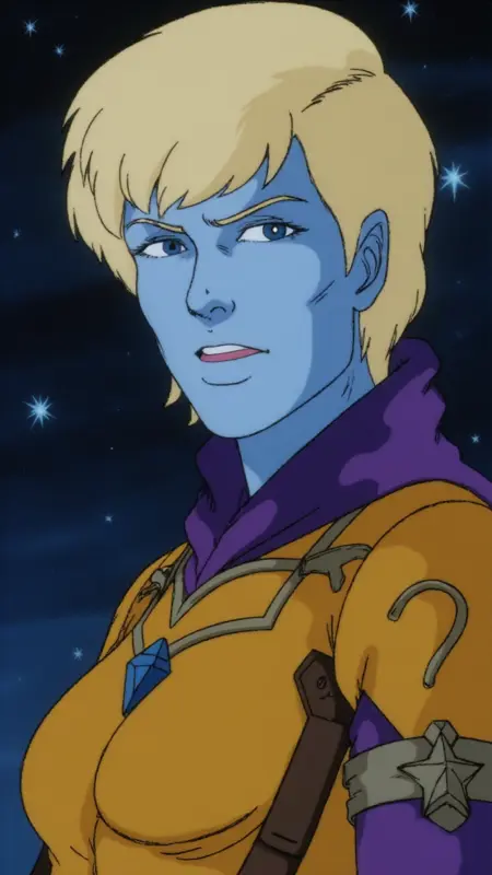 20世纪80年代的卡通风格大胆、色彩鲜艳且高度风格化,以锐利的线条、夸张的特征和鲜艳饱和的配色为标志。英雄人物通常拥有方正的下巴、健硕的体格,身着以三原色为主的标志性服装;而反派则有着棱角分明的面孔、深色斗篷和阴险的表情。头发无视重力,呈现出狂野飘逸的长发或尖锐几何形状的发型。粗黑的轮廓线使角色在精心绘制的背景中脱颖而出,背景从未来都市到神秘森林不一而足。动作场景依赖于富有动感的姿势、速度线和重复帧,伴随着强烈的闪光效果来表现爆炸和变形。载具和道具线条流畅、金属质感浓厚,并布满发光的装饰细节,凸显了对未来科技的迷恋。整体视觉风格喧闹、充满冒险精神,洋溢着超越现实的能量。