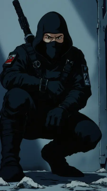 1980s, retro, low resolution, A ninja crouched in the shadowslora:Retro_Cartoons_FLUX:1