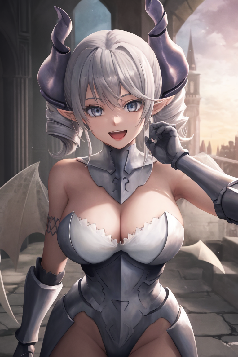 프롬프트: ladylab_ygo, 큰 가슴, 허벅지까지 오는 양말, 장갑, 젖가슴, 보석, 꼬리, 회색 머리카락, 귀걸이, 뾰족한 귀, 흰 장갑, 흰 드레스, 흰 허벅지까지 오는 양말, 스트랩 없음, 가터 스트랩, 악마의 뿔, 악마의 꼬리, 스트랩 없음 드레스, 악마의 날개