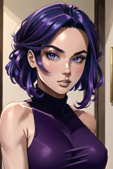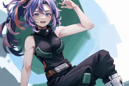 츠루미 카이나 버전: 카이나, 머리 장식, 소매 없음, 검은 바디수트, 높은 꼬리, 흰색 동공, 보라색 눈, 중간 크기 가슴, 터틀넥, 부츠.