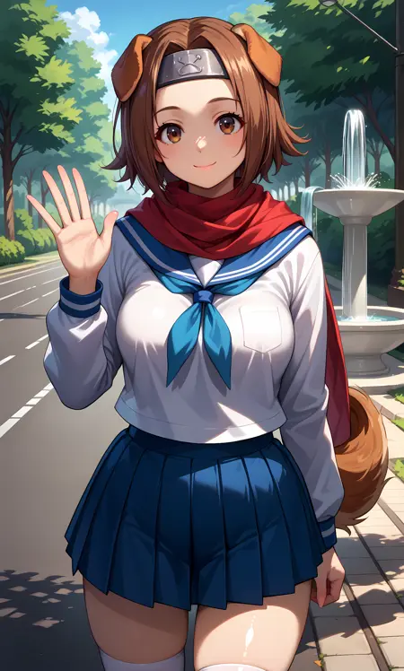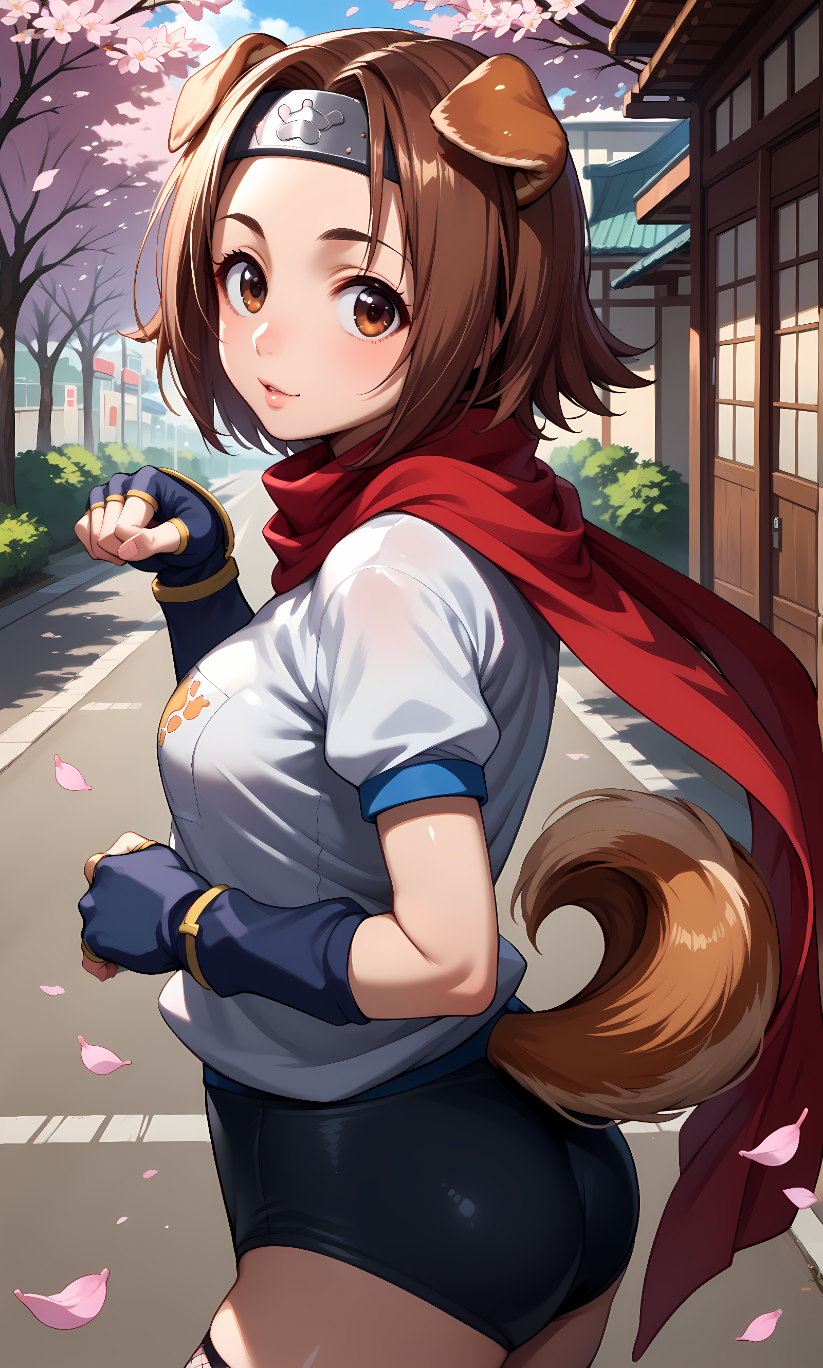 このは、茶色の目、茶色の髪、分け目のある前髪、金属製のヘッドバンド、額の保護具、犬の耳、犬の尾
