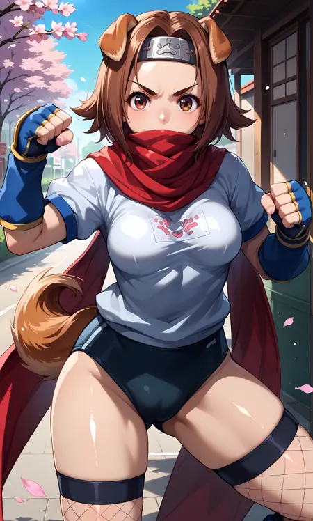 白いシャツ、 paw プリント、短い袖、黒いブルマ、フィッシュネットの太ももハイ、黒い靴下、ルーズな靴下、赤いスカーフ、サンダル、肘までグローブ、指なしグローブ