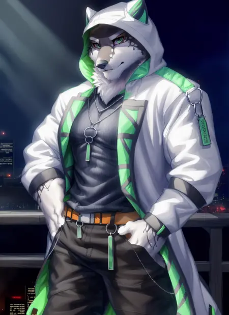 Sidekick: " jewelry, jacket, open clothes, hood, necklace, white jacket, hood up"