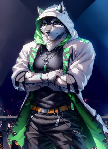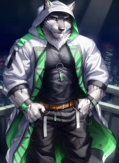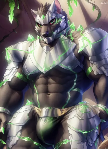 Reinforcement Prompts: " muscular, detailed eyes, black pupils, green eyes, red sclera, yellow eyeshadow, wolf tail"