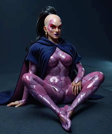 例2:score_9, score_8_up, score_7_up, score_6_up, score_5_up, score_4_up, pov+, feet closeup+, pythona1++, 涙型の瞳, ブラックケープ, 1girl, solo, breasts, cape, earrings, パープルボディスーツ++, jewelry, large breasts, lipstick, makeup, black hair, フェイスペイント+, ジェニーポニーテール++, mountainでポージング+, light colors, レトロ, アニメスタイル+