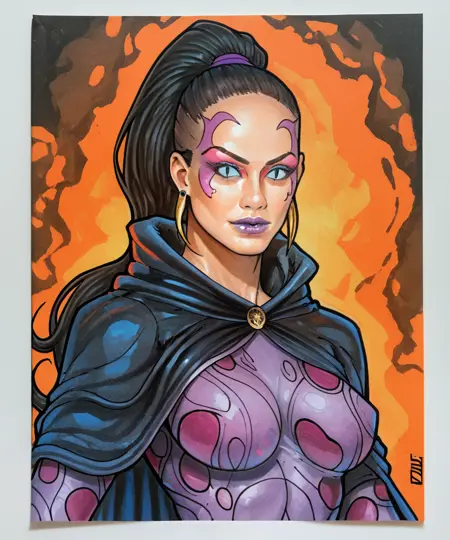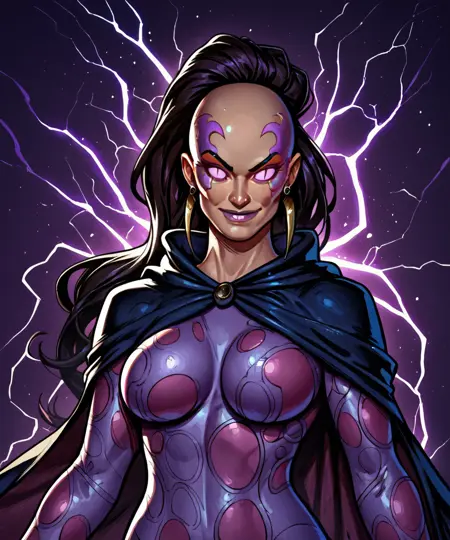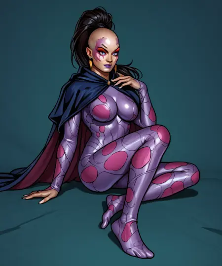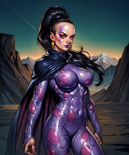 例1:score_9, score_8_up, score_7_up, pythona1++, 涙型の瞳, ブラックケープ, 1girl, solo, breasts, cape, earrings, パープルボディスーツ++, jewelry, large breasts, lipstick, makeup, black hair, フェイスペイント, ジェニーポニーテール++, mountainでポージング+, light colors, レトロ, アニメスタイル+