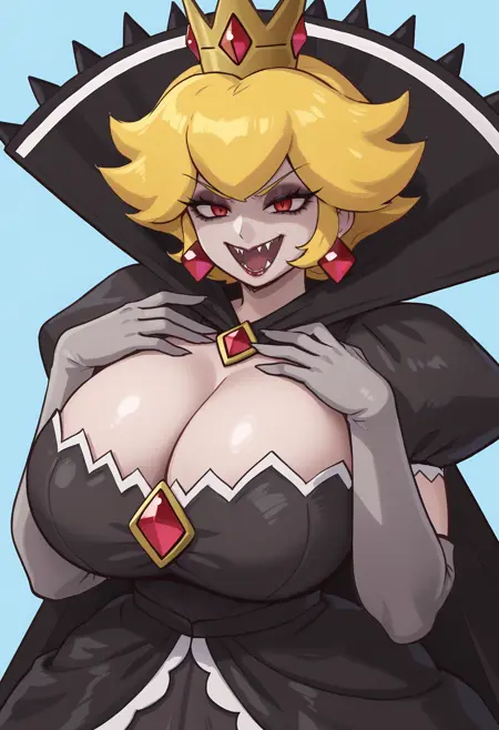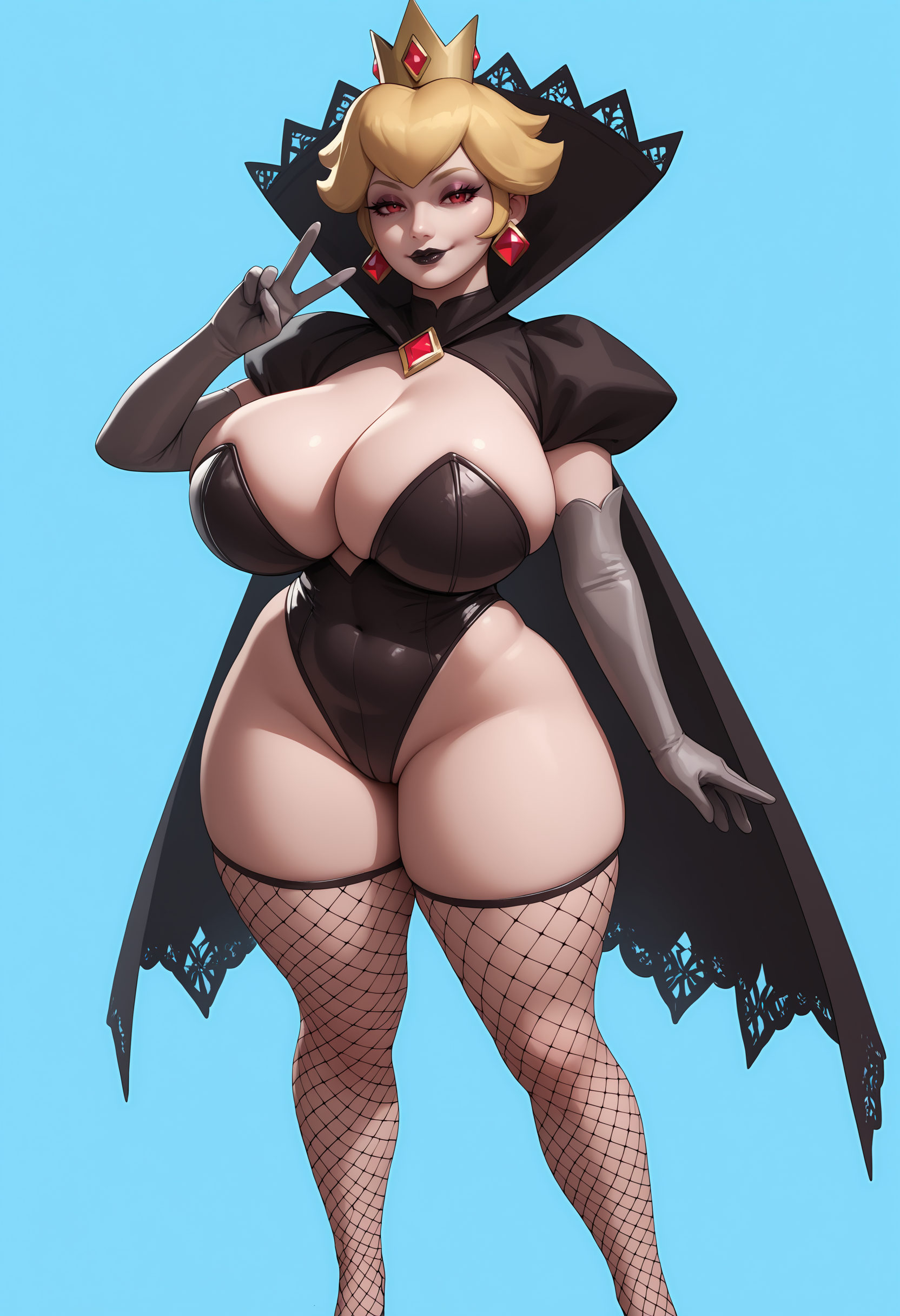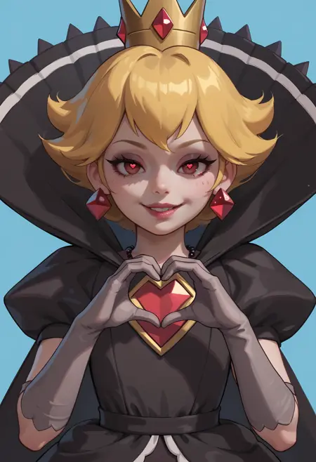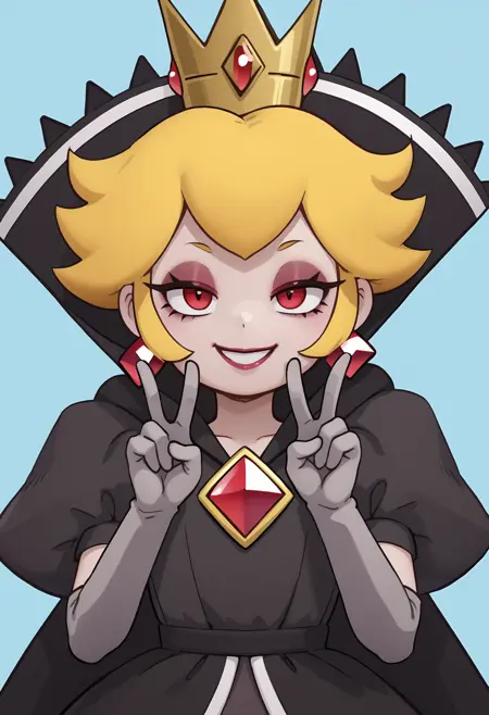 PONY: peachf, 1girl, blonde hair, gloves, elbow gloves, crown, jewelry, earrings, dress, black dress, makeup, black eyes