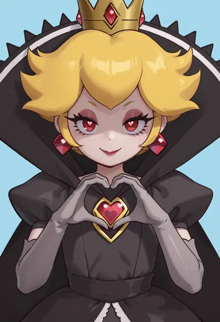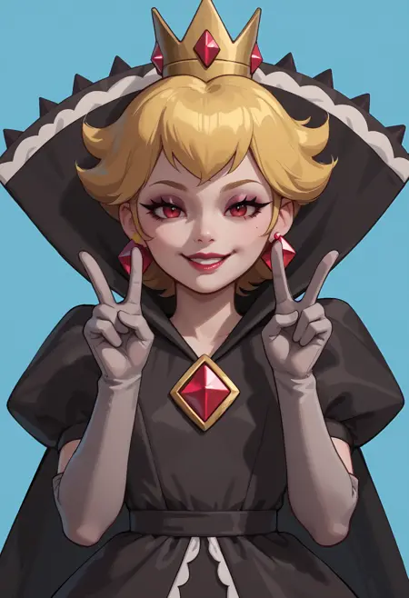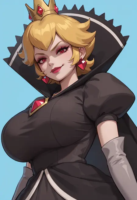 PONY: peachf, 1girl, blonde hair, gloves, elbow gloves, crown, jewelry, earrings, dress, black dress, makeup, black eyes