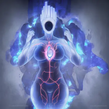 The tags "white skin, circulatory system, translucent skin, [anatomical heart]" can help to depict his bodily features as well, but they can also spawn unwanted stuff in the background.