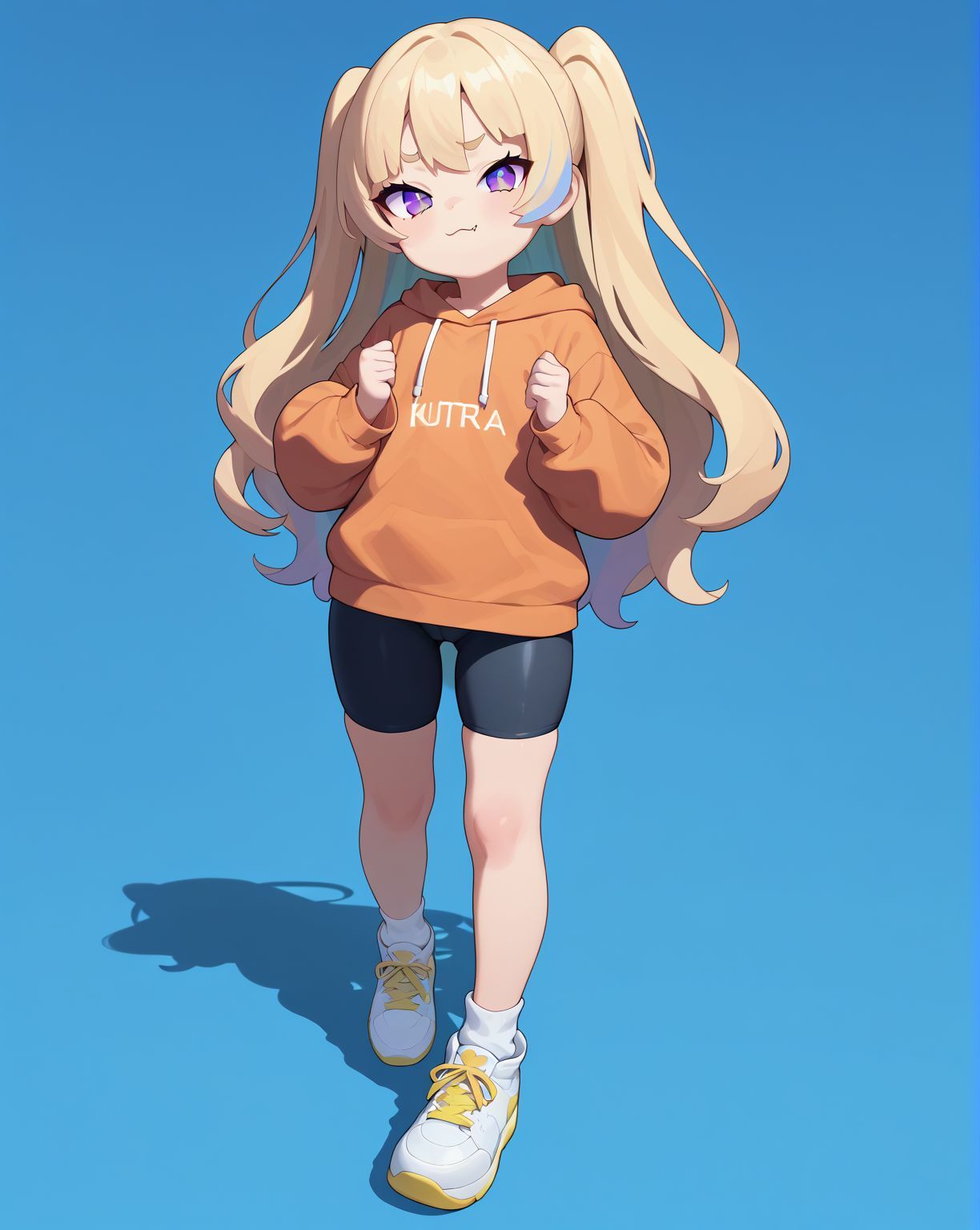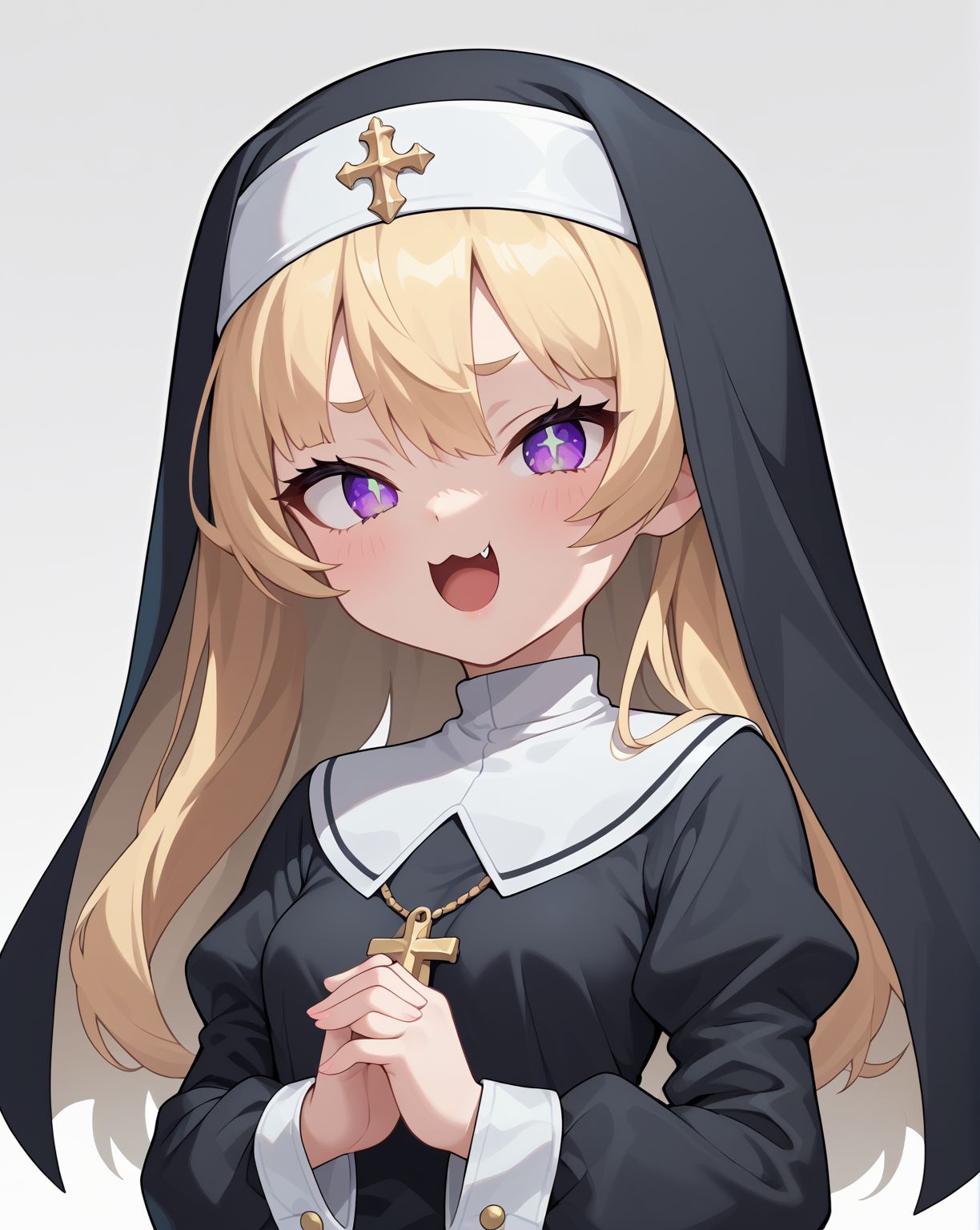 1girl、金髪、ツートーンヘア、:3、肌の犬歯、紫の目、++、